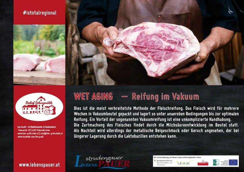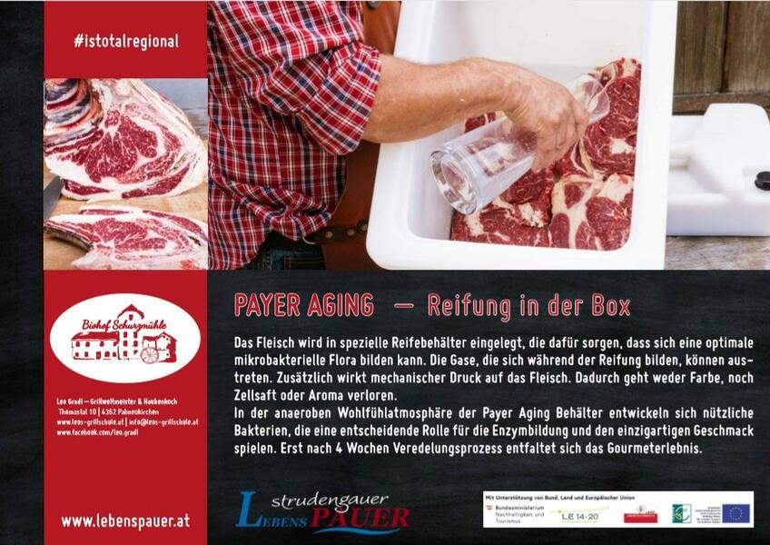 In Leos Genusswerkstatt am Biohof Schurzmühle reifen ausgesuchte Edelteile von Rind und Schwein aus der Region. Nach ausgiebiger Auszeit im Schaureiferaum, wo sie ihre Zartheit und ein unvergleichliches Aroma entwickeln, sind sie die Stars an den Hofladentagen und bei den Kursen. Die hohe Kunst der Steakzubereitung zeigt der mehrfache Grillweltmeister und Hausherr Leo Gradl z.B. im Grillkurs "Steak bloody good".